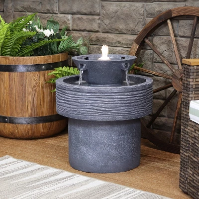 This tranquil streams water fountain with LED lights will add contemporary charm and old-country elegance to the garden, patio, deck, yard, or other outdoor space. The resin construction is designed for weather resistance while the neutral gray finish will complement many different decoration schemes. This fountain is also lightweight enough to move around from place to place easily. The flowing water streams will emit instant soothing energy as the water bubbles up through the top of the fountain and streams down the 4 spouts to the lower basin in beautiful, small waterfalls that add gorgeous visual elements. Water will then circulate through the submersible electric pump located in the center housing. No plumbing is necessary for operating the fountain. Simply place the fountain wherever desire, fill the bottom basin with water, plug it into a standard outdoor electrical outlet when it is ready to run, and enjoy your new fountain feature.