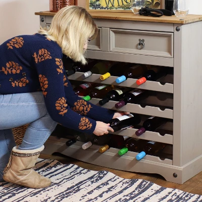 Display and organize a wine collection in style with this sophisticated wine bar table with storage. This rustic, buffet-style cabinet features 4 rows of racks to keep up to 28 bottles of wine neatly organized and a flat, tabletop surface that is great for serving food and drinks. Made from solid pine, this sturdy drawer wine rack can support up to 130 lbs overall. Each row can hold seven bottles and support up to 45 lbs. The zinc alloy drawer pulls and two-tone design give this unique cabinet an antique appearance. Plus, it features beautifully molded details that will complement a variety of decor styles and furniture pieces. The farmhouse bar cabinet features two convenient drawers for additional storage. Each drawer is capable of supporting up to 30 lbs and provides a convenient place to store corkscrews, wine charms, coasters, and other accessories. This stylish wood wine rack cabinet is a lovely addition to the kitchen, dining room, or home bar.
