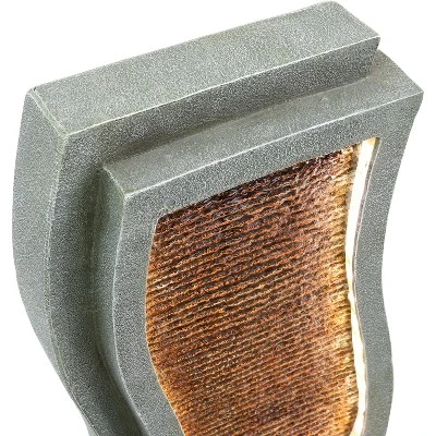 Add a beautiful and calming, modern styled water feature to your lawn, patio, yard, garden, or other landscaping area with this contemporary curves, resin, outdoor water fountain featuring LED lights. This durable exterior water feature is constructed of resin that can easily withstand the elements outdoors yet is also lightweight and much easier to move around than a traditional stone fountain. The water falls down the front face of this tower fountain over ridged edges for added visual detail and style. The interior of the textured column features two LED light strips that beautifully illuminate the water flowing down the face of the fountain at night. And, no complicated plumbing or installation is required with the included electric submersible pump that continuously recirculates the water for easy flow all day and night. This fountain also has an adjustable water flow feature so you can adjust the rate the water falls to any desired rate.