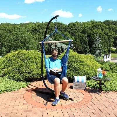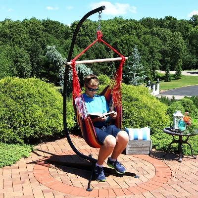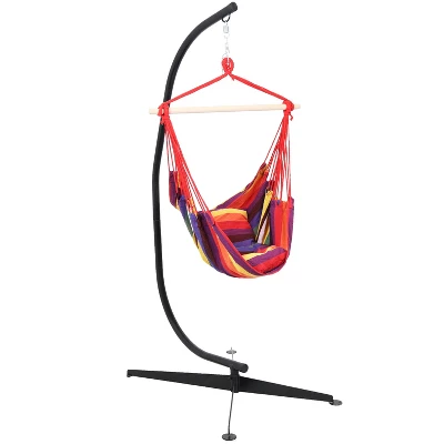 Sink into ultimate relaxation with this beautiful and vibrant swinging hammock chair. The colorful cushions provides comfort and style. This hammock chair is sure to bring a colorful spark to your space while accommodating a weight capacity of 260 lbs. Enjoy relaxing times alone with nothing but a few snacks, a great book, and the great outdoors. The included C-stand is constructed of durable, powder-coated steel. For the fabric, make sure to bring it inside or cover up your hammock chair in rainy weather to better ensure longevity. With various color options available, this hammock is sure to complement any decor. The hardware needed for hanging the chair is not included.