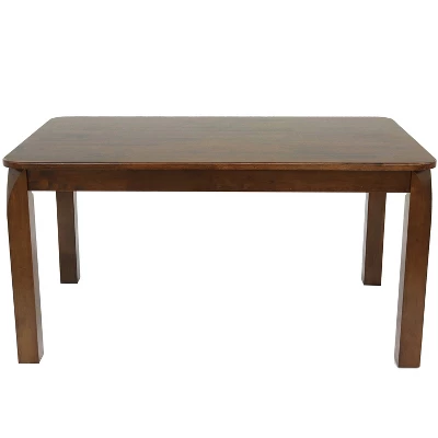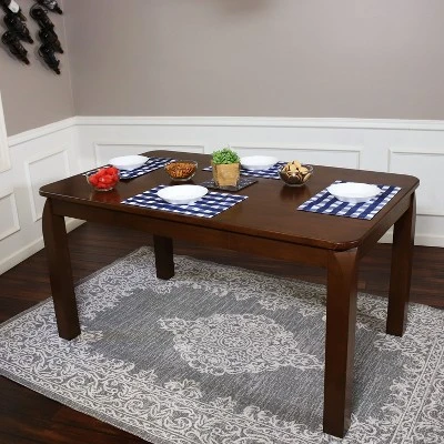 Laugh and enjoy delicious meals with family or friends gathered at this rectangle dining room table. This beautiful dining table is made from solid rubberwood and features a dark walnut finish that is sure to complement most indoor decor styles. The dining table can support up to 100 lbs at a time, ensuring it is strong enough for any family gathering. There is enough room to comfortably seat 6 people around this wood dining room table. This table features a flat, smooth surface that is great for playing board games and card games to create fun memories with friends or family. Assembling this dining table for 6 is a breeze with the included step-by-step instructions. Simply connect the legs onto the tabletop and put the table anywhere indoors. The rectangle table is designed to be used in a dining room or kitchen, but the smooth top also makes it great for an at-home office.