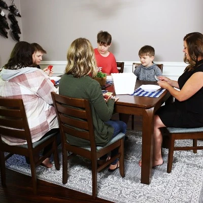 Have dinner with the whole family gathered around this 7-piece indoor dining table and chair set. This set includes a rectangular dining table and 6 ladder-back chairs to accommodate the entire family. Each piece in this set is made from solid rubberwood which is a durable hardwood that requires little maintenance. Simply spot clean problem areas to refresh the appearance of the furniture and to return it to its original crisp, clean condition. The dining chairs feature a cushion made of polyester and stuffed with polyurethane foam for extra comfort while dining, chatting, or enjoying drinks. This furniture set will surely catch the eye of every guest you invite inside with its stunning nature. Designed for indoor use only, this wooden table and chair set is a great place to gather in the kitchen, dining room, or bar. Every piece of this dining set has padded feet to protect your kitchen floors from any scratching or scraping that it may otherwise face.