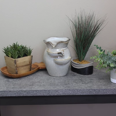 Make any home, office, or living space more tranquil and serene with this elegant cascading tabletop water fountain. Its small size makes it the right size for desktops, end tables, and coffee tables. Water gently flows from the top tier with the gently curved edges down into the side tiers below. This small water feature will spruce up a desktop in any office cubicle or the counter in the kitchen. Place this fountain on a shelving unit in the bedroom, living room, or other indoor space for a calming, Zen experience. Everything needed to put this decorative accent is in the box, including 1 indoor tabletop fountain and 1 electric submersible pump. The submersible pump continuously circulates water through the fountain for endless relaxation. No plumbing is required. Simply plug this fountain into an electric outlet and relax. Plus, it makes a great gift for a wedding or housewarming party.