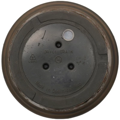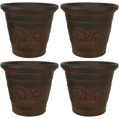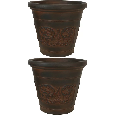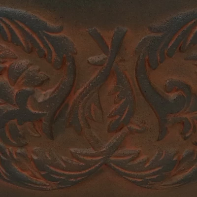 Give plants an elegant base on the patio or porch with this decorative plant container. Ferns, flowers and other plants will look great in this traditional-style planter. Featuring an ornamental leafy vines design, this planter evokes the look of classical-style plant containers found on English manors and estates. The hand-painted finish gives this piece an attractive time-worn look with a rich, warm color reminiscent of metal. While this flower pot has the look of an older vessel, it is made with very modern materials. The linear low-density polyethylene construction helps this planter withstand the elements, from resisting cracking from cold temperatures to combating damage from harmful UV rays. It is also built to shield and insulate plant roots from sudden changes in temperature, thanks to the full-depth inner wall. Another great benefit of this double-wall structure is that the space between the walls can be filled with sand or gravel to keep the planter in place in windy areas. Additionally, the planter can also be used as a decorative accent inside the home when paired with a protective saucer.