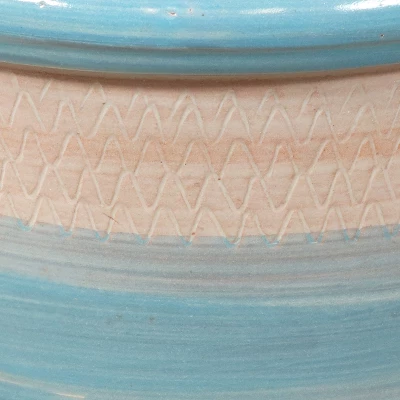 Display vibrant flowers, luscious greenery, or any kind of plant, and add a vibrant, decorative touch to the porch, patio, yard, or living room with this set of two beautiful ceramic planters. With two identical pots, it’s easy to create a cohesive look anywhere. Set the planters on the front step or porch for some symmetry, or place them at different heights on a plant stand (stand not included) in the living room. Designed for indoor and outdoor use, these planters are great for growing flowers, greenery, or herbs anywhere. This planter pot set is made from durable ceramic clay with a mineral glaze finish for added resistance to the elements and long-lasting beauty. These ceramic planters have 1 drainage hole in the bottom to allow excess water to drain out. Always use a saucer (saucer not included) beneath the planter when placing them indoors to avoid spilling excess water on the floor.