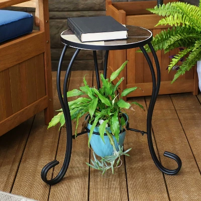 Use this handy dandy little table to display your favorite potted plants while setting down your drink or book of the day. This accent table features a lower planter, beneath the tabletop space, that is great for smaller planters and pots. Place a photo or collectibles on the top and one in the lower planter and accommodate up to 2 plants at a time! This ceramic mosaic tile side table and plant stand works wonderful as a side table to any patio or deck set, couch, chairs, or perfectly placed in the corner for a beautiful accent. The sleek, contemporary design is engineered to last with a powder-coated steel frame and a ceramic top tile, sure to complement any other existing decor. The steel framed legs feature swirled feet for a beautiful touch to any space. Never run out of tabletop space with this table and planter, all in one!
