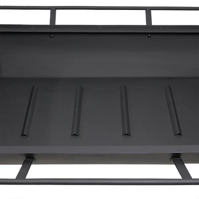 This unique, rectangular, Northland Grill outdoor fire pit features a trapezoidal metal mesh topper for keeping sparks and embers contained while cooking your favorite foods over the fire. Its grand, lengthy design with convenient grilling area is great for parties of all kinds. It incorporates a cooking grate that makes it ideal for BBQ areas on patios and in backyards. The fire pit is made from solid steel and is durably finished in black for a contemporary look and resistance to the outdoor elements. A hinged access door on the side of the mesh topper provides easy access to burning logs and the grilling surface. A tubular metal rail encircles the brazier, making it easy to lift and move. An ideal outdoor fireplace for patios and yards, this unit comes with a grilling grate, a multi-purpose poker tool to safely maintain the fire, and a durable, fitted vinyl cover to keep this fire pit and grill safe on the off-season!