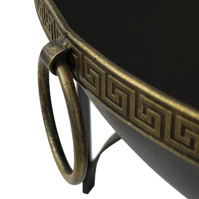 Enjoy a warm fire in the backyard with friends or at the cabin with this sturdy, metal, contemporary fire bowl with handles and an included spark screen. Featuring a stylish Greek key design along the edge of the bowl, this fire pit will make an attractive accent in any outdoor living space. This heavy-duty steel fire pit is strong and naturally durable against the outdoor elements. This fire pit comes complete with a spark screen, log grate and poker. Sit back and relax while taking in the warmth of the fire without the stray sparks with the included spark screen. The included log grate keeps firewood elevated in the fire pit, promoting better air flow and maintaining optimal conditions for a fire. This fire pit is also easy and simple to put together, so marshmallows will be toasted over the flames in no time.