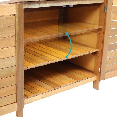 Keep your seasonal and outdoor items easily accessible and neatly stored with this wooden garden storage shed. Durably constructed of meranti wood, this small utility shed features a teak oil finish that enhances the natural beauty of the wood and protects it from some weather conditions. The hinged doors make it easy to open and close the storage shed as needed. Store and retrieve items when needed by pulling on the 1.25″ diameter wooden knobs on each door to access the shelves inside. The top shelf can be placed in two different spots, making it easy to customize for your needs. This storage cabinet is ideal for keeping garden tools, pool toys, outdoor pillows and cushions, and other outdoor necessities within reach on the lawn or patio. This product includes the hardware and components required for assembly. Please note, a Phillips screwdriver is required for assembly but is not included.