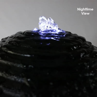 • SOOTHING WATER SOUNDS: Relax and enjoy the peaceful sounds the yard waterfall fountain creates as water bubbles out of the top and flows down the ball. Needs direct sunlight to run during the day and store energy in included battery pack.