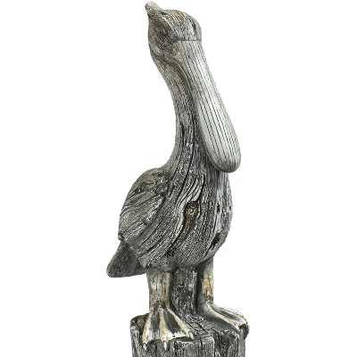 Add coastal charm to any lawn or garden with this perched pelican outdoor garden statue. Constructed of polystone, this beautiful pelican portrays a wood-like texture that is easy to maintain in a variety of indoor or outdoor settings. Polystone is a compound made up largely of polyurethane resin mixed with powdered stone additives that give it added weight and a porcelain or stone-like feel. Polystone is still lightweight enough to maneuver easily while remaining durable against the outdoor elements for long-lasting use and style. This attractive lawn ornament beautifully depicts a single pelican resting atop a wood pillar overlooking any patio, deck, garden, yard, poolside, or other landscaping wherever placed. The realistic details add to the appeal of this nautical statue. This unique bird would look great when placed near the entrance of the home, standing elegantly next to a pond or small creek, or in the front yard to see all who pass by.