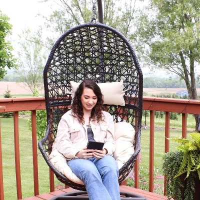 Add an attractive and unique outdoor seating option anywhere with this hanging egg chair. This chair is constructed of a strong steel frame wrapped in resin wicker, polyethylene rattan. This material is smooth to the touch and will not splinter, break, crack, or chip easily like natural rattan. The combination of these materials ensures that the chair is weather resistant yet stylishly comfortable. For added softness and padding, this chair also includes an easy-to-maintain cushion and headrest. The steel stand features an attractive, powder-coated finish that resists rust for long-lasting enjoyment. Can’t wait to sit back in your new chair? No problem! The 2-piece assembly and included hardware makes it much simpler to set up and use this unique piece of furniture. Enjoy the comfort and style of this versatile chair and stand on the patio, porch, deck, balcony, and any other outdoor living space where extra relaxation is needed.